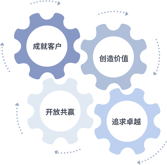成就客户是一切决策的出发点,,,,创造价值是衡量所有工作的标准,,,追求卓越是我们做事做人的态度,,,开放共赢是我们的格局也是最终的结果。。。价值观的齿轮环环相扣,,,,推动着组织里的每个人不断向前。。。